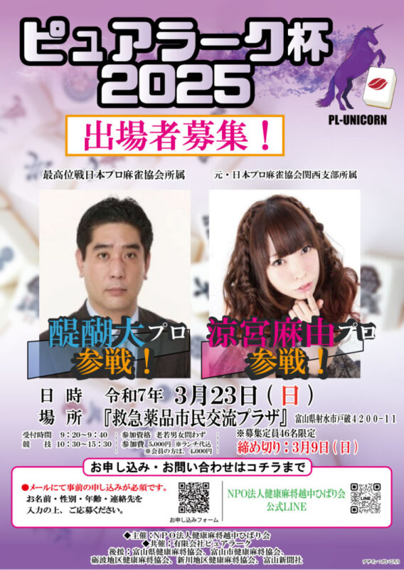 この交流大会は、大手生命保険会社の『明治安田』さんとのコラボレーション企画として、健康麻将交流大会を開催します。 「富山麻将アンバサダー 水谷 葵プロ(…