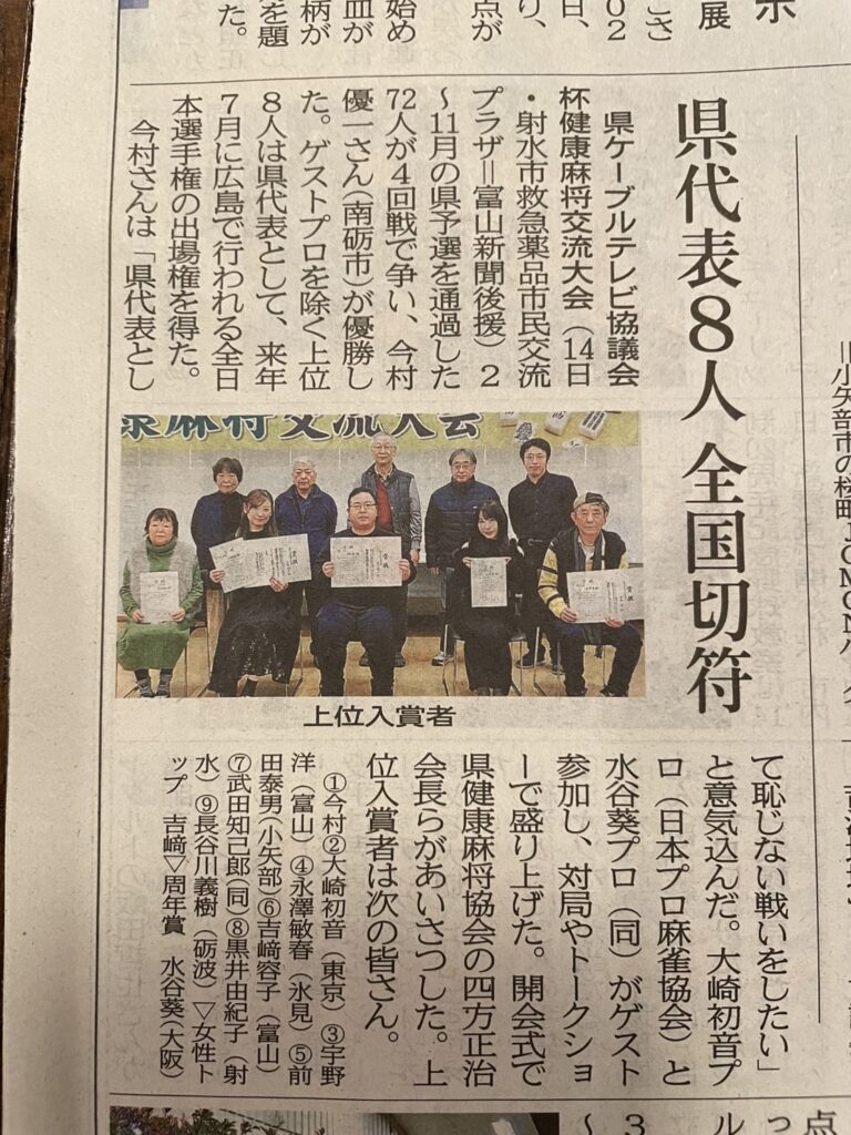 12月14日に、富山県代表選考会決勝大会が開催されました。2~11月の県予選を通過した72人が4回戦で争い、今村さんが優勝しました。